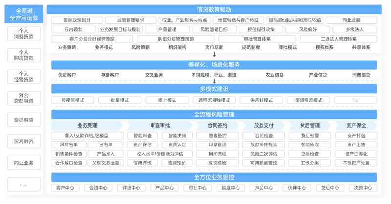 在業(yè)務應用層面,以“雙客”(客戶經(jīng)理、客戶)為中心、線下產(chǎn)品線上化、場景數(shù)字化,對不同行業(yè)、類別、風險等客戶提供差異化服務,實現(xiàn)“千人千面”、“千人一面”,為客戶提供量身定制的信貸產(chǎn)品,滿足不同客戶群體的需求;通過無紙化、業(yè)務移動化、流程可視化,優(yōu)化信貸業(yè)務流程,簡化辦理流程,提升精細化管理水平;以業(yè)務邏輯劃分各個獨立又互相協(xié)作的能力中心,包括客戶中心、產(chǎn)品中心、定價中心、額度中心、審批中心、評級中心、押品中心、貸后中心、核算中心等,支持金融機構以此為依托進行個人貸款、對公信貸、同業(yè)信貸、集團信貸、小微信貸、普惠業(yè)務、網(wǎng)貸業(yè)務(包括助貸、聯(lián)合貸、信用付)等各類貸款業(yè)務的產(chǎn)品創(chuàng)新和運營創(chuàng)新。