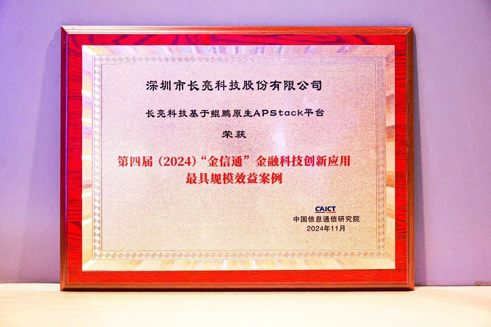 會議期間,第四屆(2024)“金信通”金融科技創新應用案例入選名單重磅揭曉,該榜單旨在匯集金融科技支持“五篇大文章”相關創新應用案例,形成一批可復制、可推廣的金融科技實踐經驗。長亮科技“基于鯤鵬原生APStack平臺”從600余份行業應用案例中脫穎而出,獲得業內高度認可,成功獲評“最具規模效益案例”。