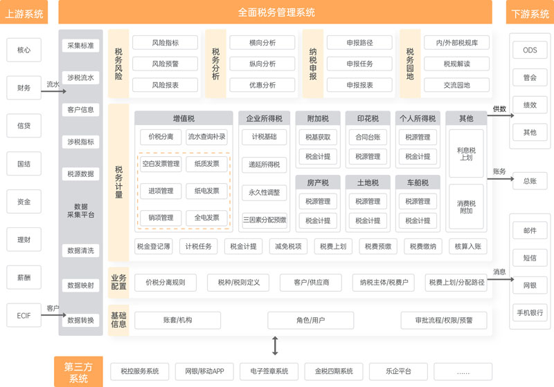 對金融機構的增值稅及其附加稅、印花稅、房產稅、土地使用稅、車船稅、個人所得稅、企業所得稅等全部稅種進行涉稅事務管理,采集各稅種對應的業務數據形成涉稅檔案并計提相應稅費,自動出具納稅申報報表;集中實現了增值稅價稅分離、銷項管理、進項管理、發票開具、所得稅匯算清繳等功能,幫助企業及時分析稅負和籌劃稅務。
