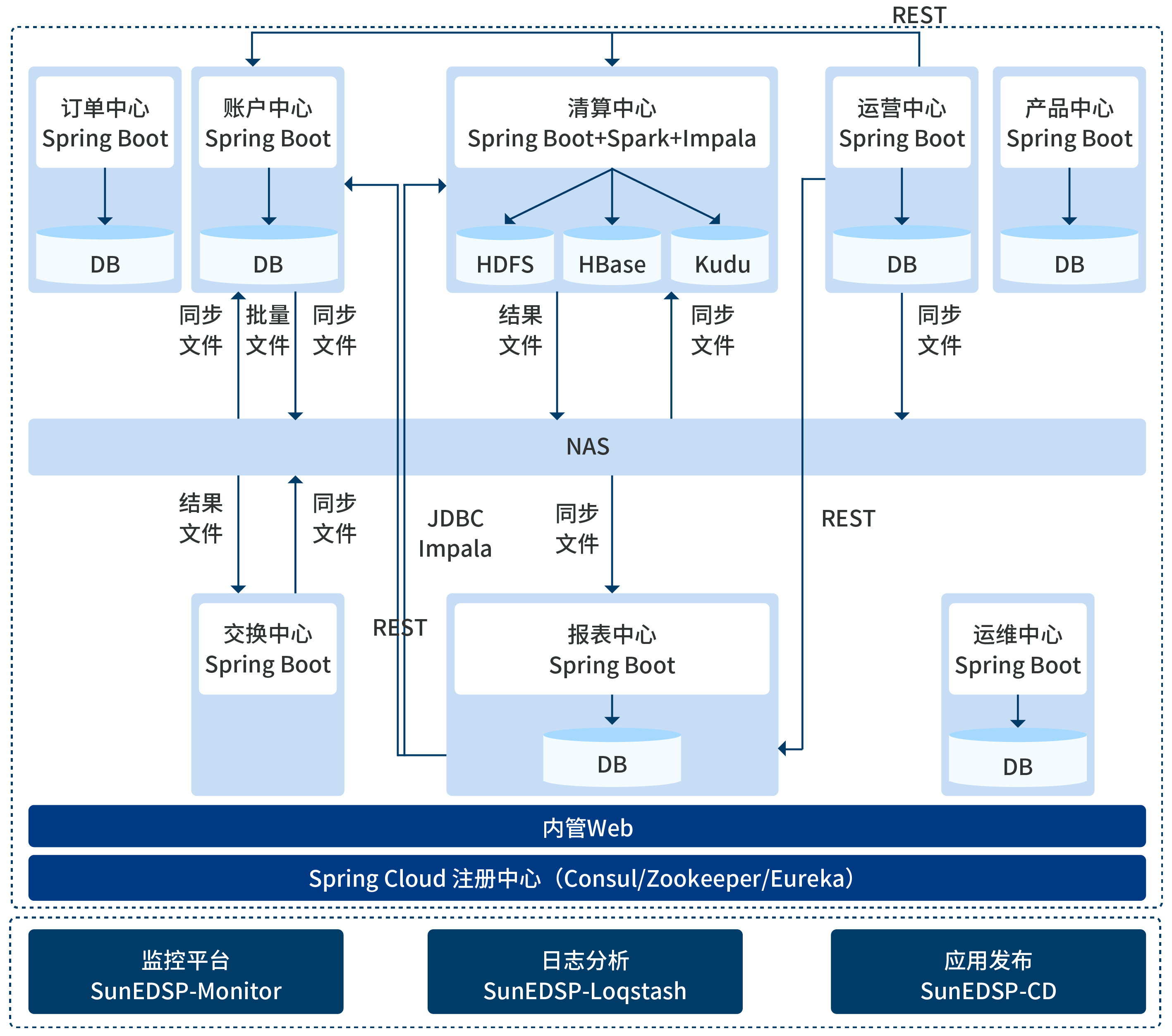基于對接金融機(jī)構(gòu)的業(yè)務(wù)場景和運(yùn)營經(jīng)驗(yàn),采用微服務(wù)系統(tǒng)架構(gòu)設(shè)計(jì),通過敏捷的開發(fā)模式驅(qū)動(dòng)和先進(jìn)的技術(shù)體系,搭建包括清算中心、訂單中心、賬戶中心、運(yùn)營中心、交互中心、報(bào)表中心在內(nèi)的一體化服務(wù)系統(tǒng),提高清算系統(tǒng)的吞吐量、并發(fā)數(shù)和響應(yīng)速度,實(shí)現(xiàn)流程監(jiān)控簡單、可控。